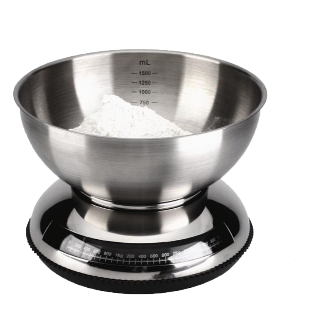 3.0kgs capacity kitchen scale inside of bowl with etched scale at the wall