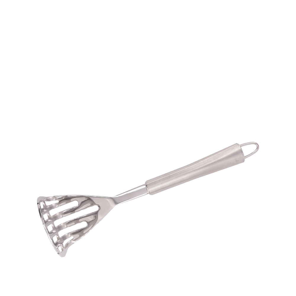 Potato masher with curved handle
