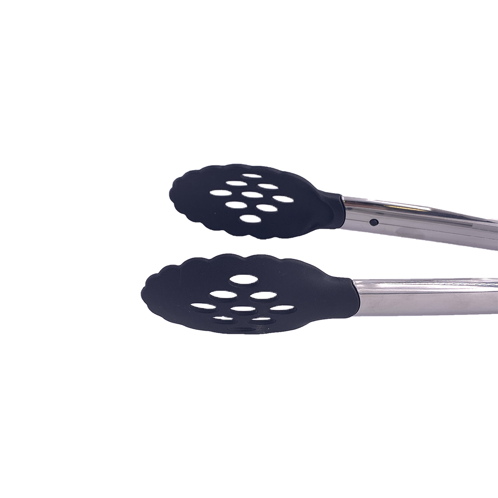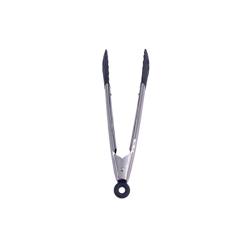 Satin finished serving tongs with locker, silicon head and TPE grip
